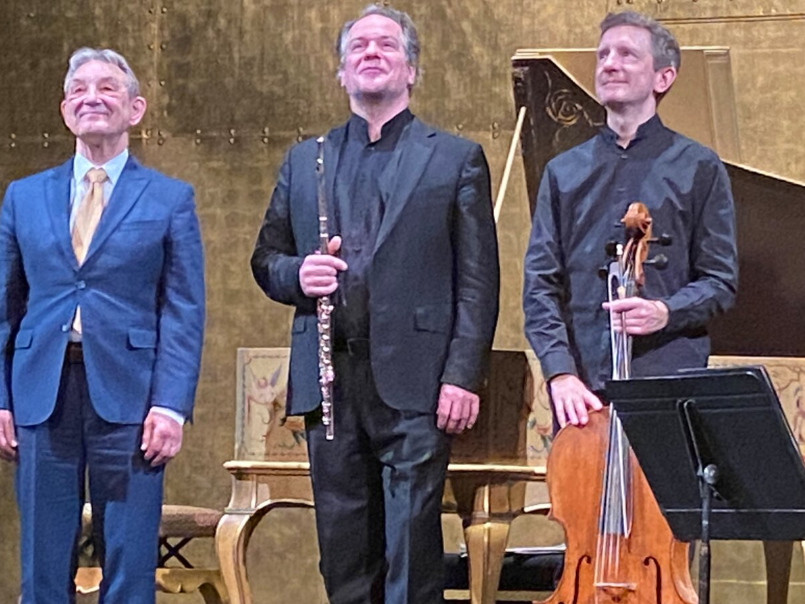 Dimanche 22 janvier 2023 au Théâtre des Champs Élysées, au-delà même de la perfection technique, c’est à une célébration rare de la fluidité que se sont livrés Emmanuel Pahud, Trevor Pinnock et Jonathan Manson dans les Sonates pour flûte de Bach, reprenant le programme de leur enregistrement de référence de 2008 pour EMI Classics (aujourd’hui Warner Classics). On savait la ligne claire et la lecture lumineuse de ces pages qu’avaient proposée les trois musiciens dans leur enregistrement. Mais les réentendre quatorze ans plus tard dans l’extrême spontanéité de leurs jeux complémentaires et dans cette sorte de simplicité d’un concert exceptionnel fut un délice à peine descriptible. Car même en tenant compte de ce respect considérable que partagent tant d’amateurs de baroque pour Trevor Pinnock et même dans l’admiration unanime qui entoure à juste titre Emmanuel Pahud depuis toujours, on ne s’attend jamais tout à fait à tant d’excellence, justement dans une simplicité aussi désarmante – tant de beauté en somme.