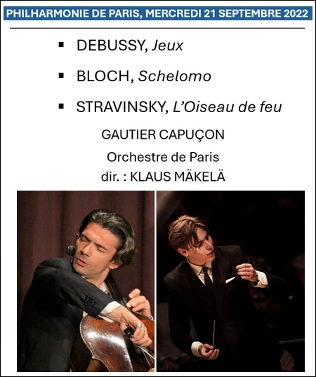 Un concert en technicolor, habité et électrisé à la Philharmonie de Paris mercredi 21 septembre 2022 par Gautier Capuçon et Klaus Mäkelä à la tête de l’orchestre de Paris. Une merveille. Rien n’y fait : on a beau savoir déjà et depuis plusieurs années, que Gautier Capuçon est aujourd’hui l’un des musiciens les plus accomplis et les plus marquants de la scène française et internationale, on ne peut éviter d’être continuellement impressionné (et pourquoi ne pas le dire « bluffé ») par chacune de ses représentations. Pour ce concert de septembre, dans un programme de vrais « coloristes » (j’y reviendrai) il a donné le très rare Schelomo d’Ernest Bloch, rhapsodie hébraïque pour violoncelle et orchestre de 1916, qui fait partie de la si attachante part hébraïque de l’œuvre de Bloch.