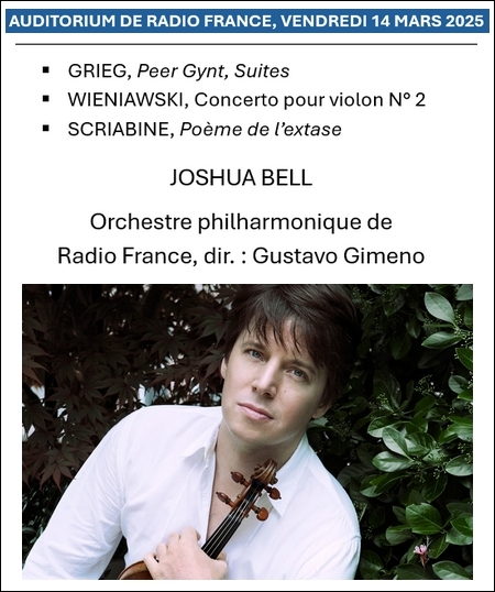 Certains concerts tiennent si largement les promesses nourries dans leur perspective, que le sentiment qu’on peut en avoir dépasse lui aussi tous les horizons d’attente. Lors des concerts de l’auditorium de Radio France, j’aime tout : le lieu, très beau en soi (cet Auditorium qui fêtait ses 10 ans en octobre 2024), le fait de se savoir au cœur du service public de la musique, et le cérémonial de ces « concerts du soir » au début desquels les animateurs de la maison viennent présenter la soirée. Les présentations de concerts, annoncées par le gingle quelque peu solennel qui vous rappelle que vous êtes bien à la radio, mettent ici dans une certaine ambiance, et c’est indéniablement celle de la mission de transmission assurée par France Musique. Ce soir-la c’était Clément Rochefort, venu introduire ce concert à teneur très « philosophique » en quelque sorte, avec les Suites de Peer Gynt de Grieg, et les alcools forts du Poème de l’extase de Scriabine. Le très virtuose deuxième concerto pour violon de Wieniawski, était servi par un Joshua Bell au sommet de son expressivité incandescente et un Philharmonique de Radio France en verve, sous la direction habitée de Gustavo Gimeno. Concert des extrêmes du romantisme, et de la densité spirituelle conçue comme enjeu d’un programme ambitieux : l’un des rendez-vous importants de cette saison selon moi, ne serait-ce que pour la présence de ce violoniste exceptionnel qu’est Joshua Bell.